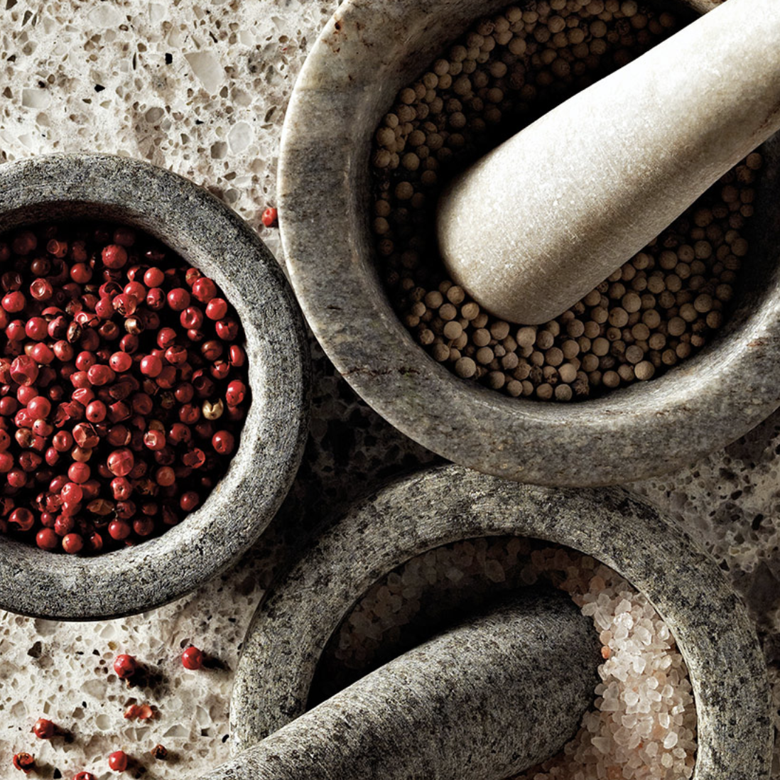 A light grey base peppered with whites, browns, and blacks, in a mix that conjures the purity of unrefined sea salts.