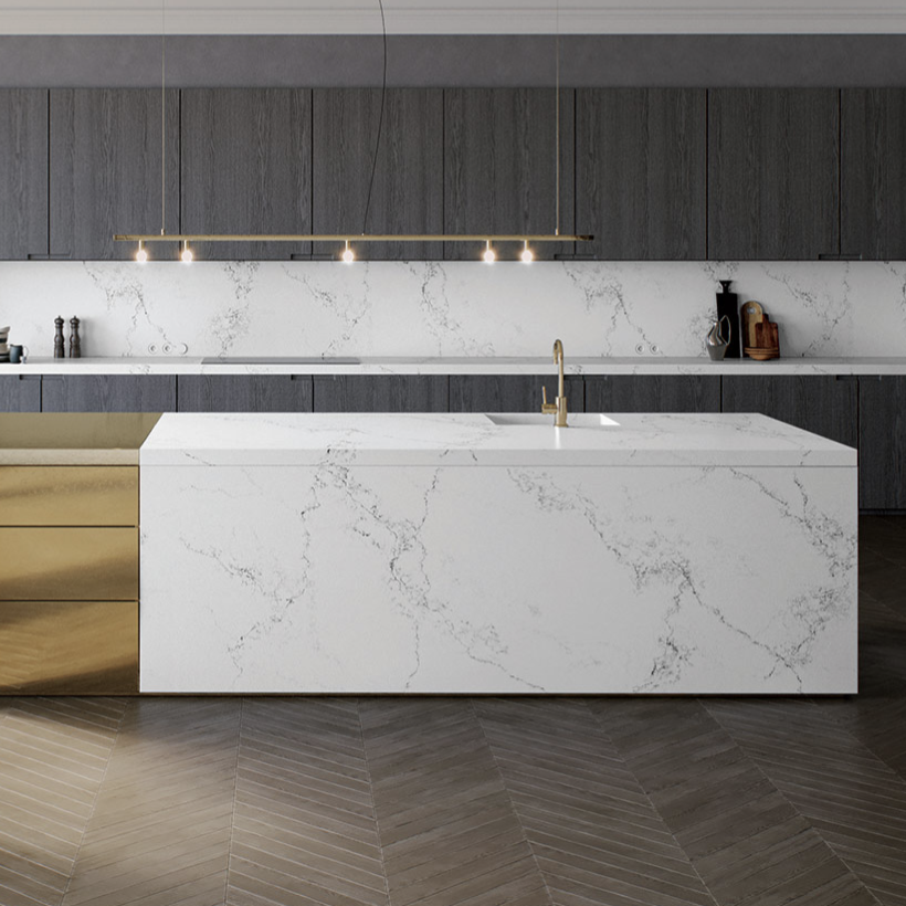 Empira White offers the natural look of the best Calacatta Marble with deep grey veining on a timeless white backdrop