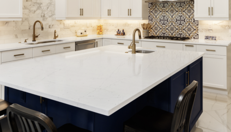 Quartz countertops are the hardest stone surfaces, made from naturally occurring minerals that are one of the hardest (7 on the Mohs Scale of 10). Classic quartz uses up to 90% of the purest quartz particles, melded with resins and pigments to make the most resilient surfaces on the market. Quartz countertops are produced in a strictly controlled environment to meet the most stringent safety standards in both manufacturing and finished product.