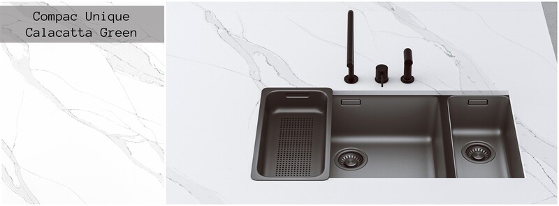 Compac Unique Calacatta Green is Ideal for use as Kitchen Worktop, Island Worktop or a splashback.