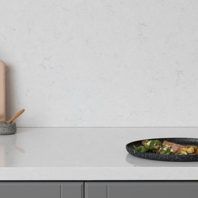 With intricate soft grey veins lined throughout, White Water mimics the serene nature of flowing waves, creating a tranquil and inviting feeling. If you’re wanting to add a touch of luxury to your kitchen, team this marble-like surface with stainless steel or bold, matte black appliances – or even a classic White Water splash back.