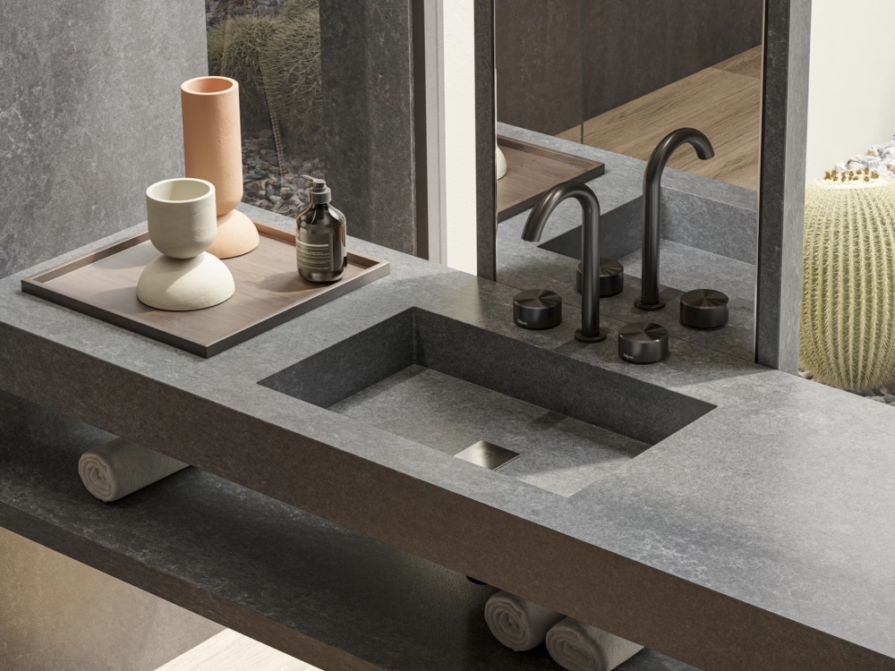 Silestone Raw G - a grey quartz surface from Cosentino that features a serene, concrete-like appearance with subtle copper touches and fine, nebulous veins. It is an ideal choice for creating a modern, industrial, or minimalist aesthetic in kitchens and bathrooms. The surface has a natural, industrial concrete look, but with the added elegance of subtle metallic and fluid vein details. Suede finish