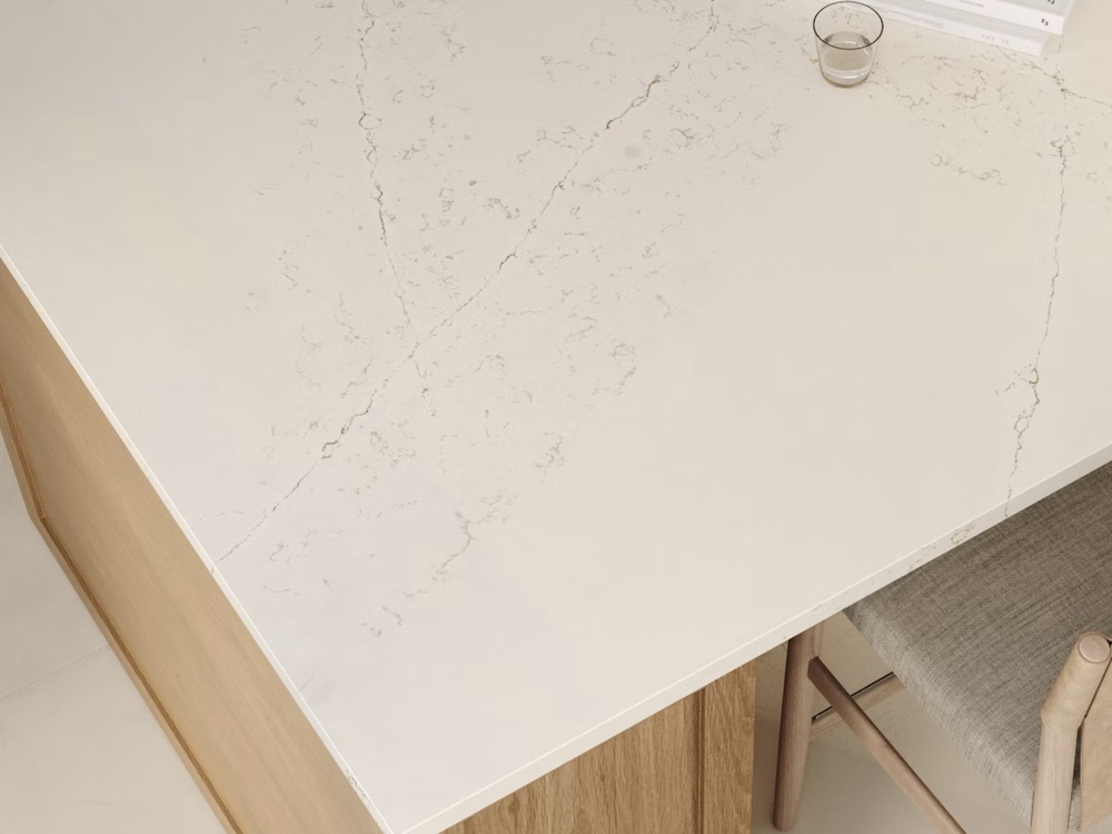 Silestone Siberian is a quartz color featuring a creamy white background with delicate grey and warm veins. The surface has a creamy white base with a subtle pattern of intertwining warm and grey veins, creating a serene, elegant, and timeless look.